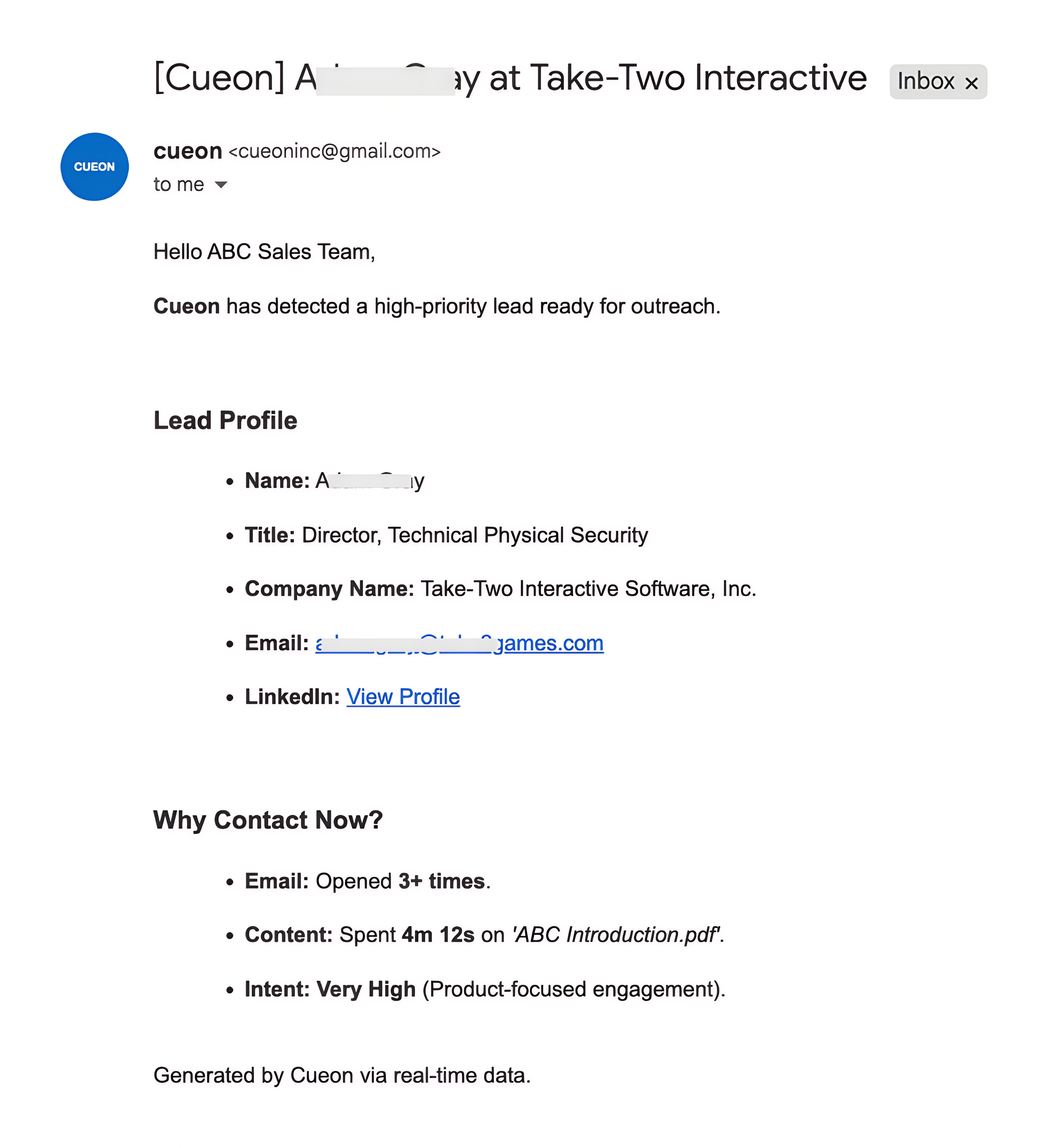 Built by AI and humans together, CueOn tracks prospect engagement to identify who is ready to buy. CueOn helps sales teams contact the right prospects at the right time, book more meetings, and win new customers.